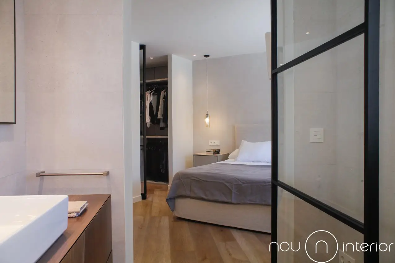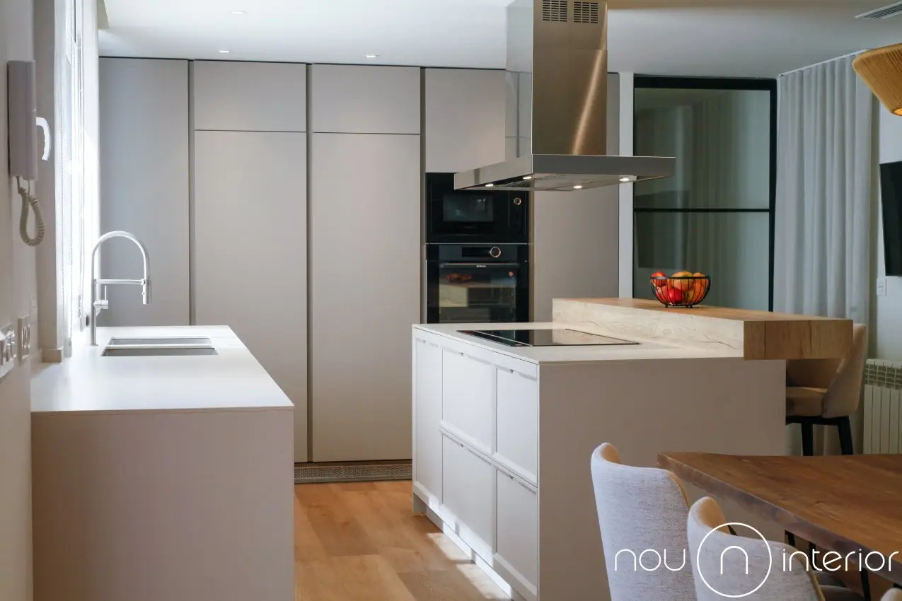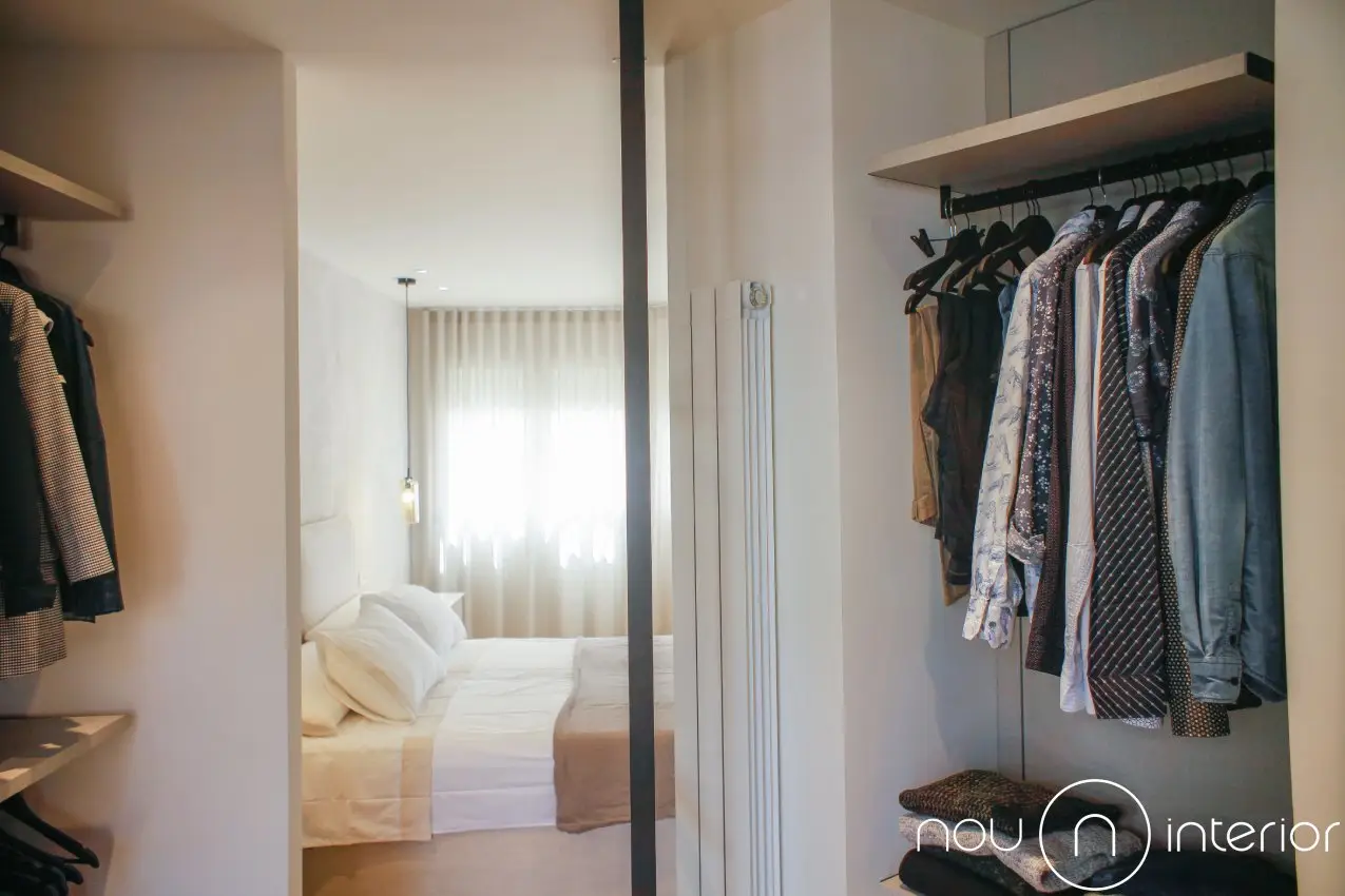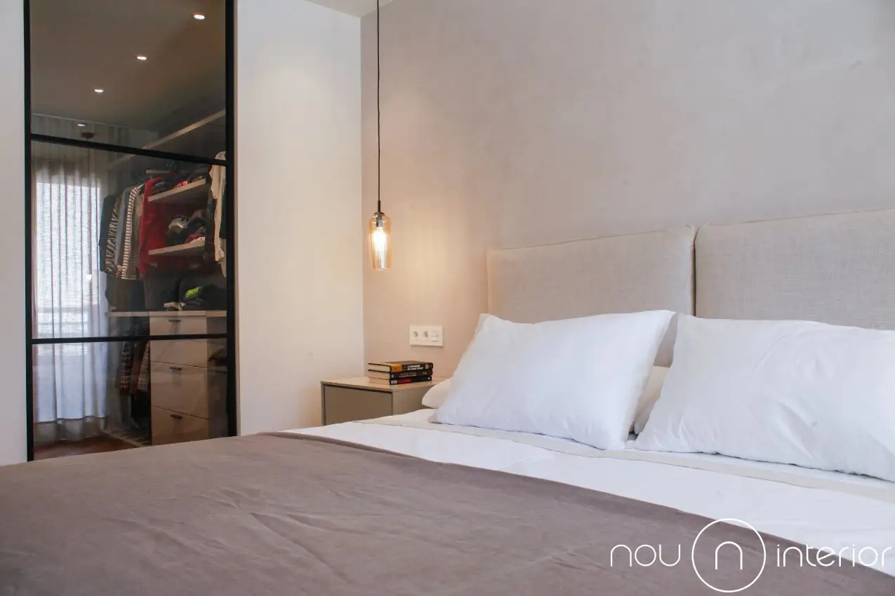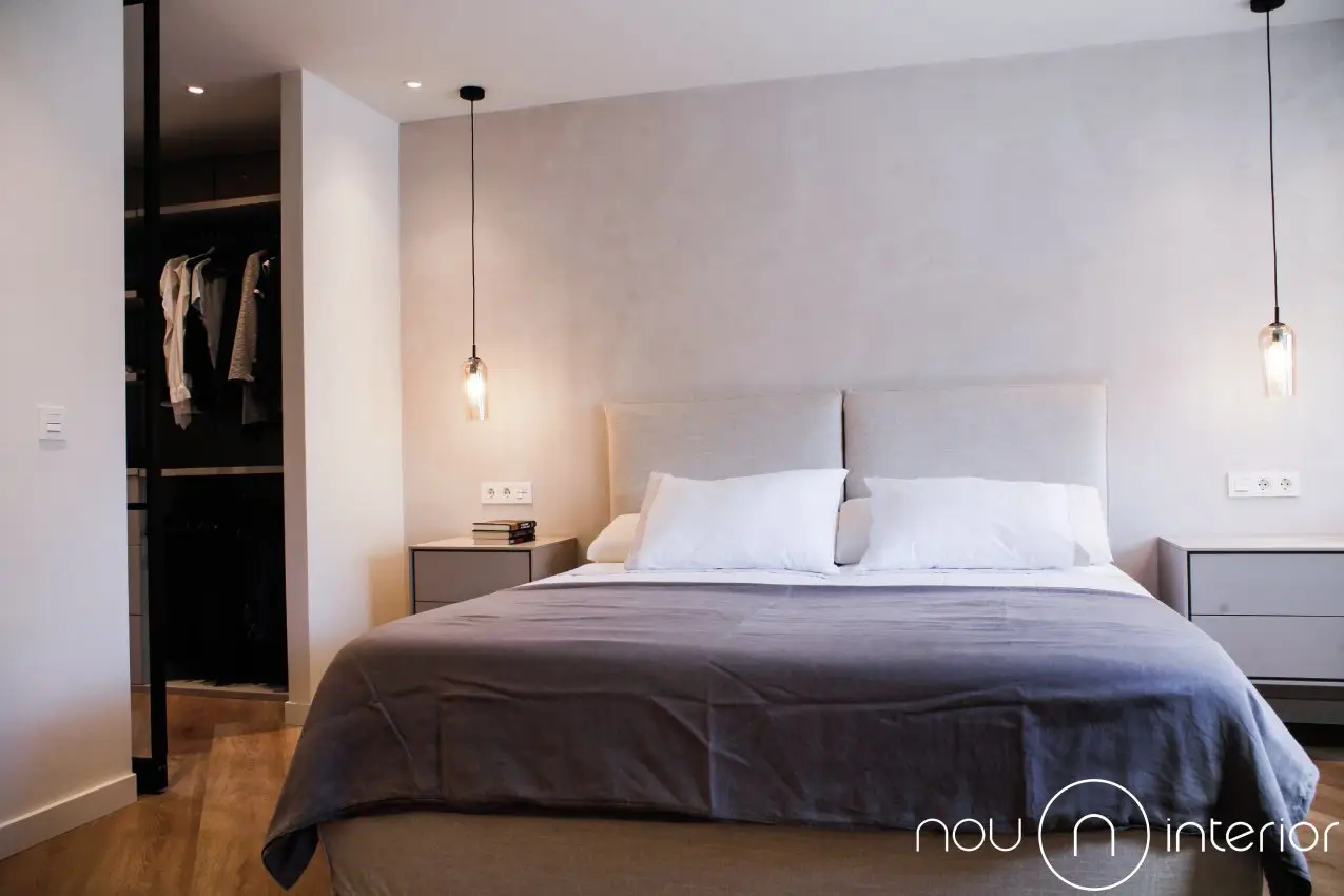 Nos decidimos por un proyecto abierto que unía cocina, salón y comedor. También se amplió la habitación principal uniendo el baño e instalamos dos líneas de armarios vestidores.