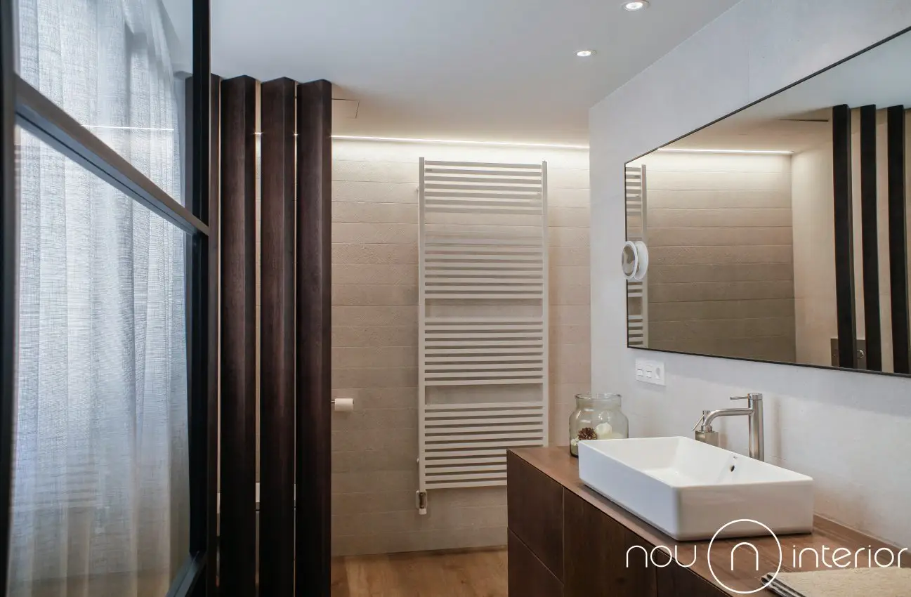 Colocamos tarima de roble y la acompañamos con una paleta cromática combinada de blancos y grises. Los baños se revistieron con porcelánico piedra, su textura natural aporta gran personalidad y calidez a la estancia.